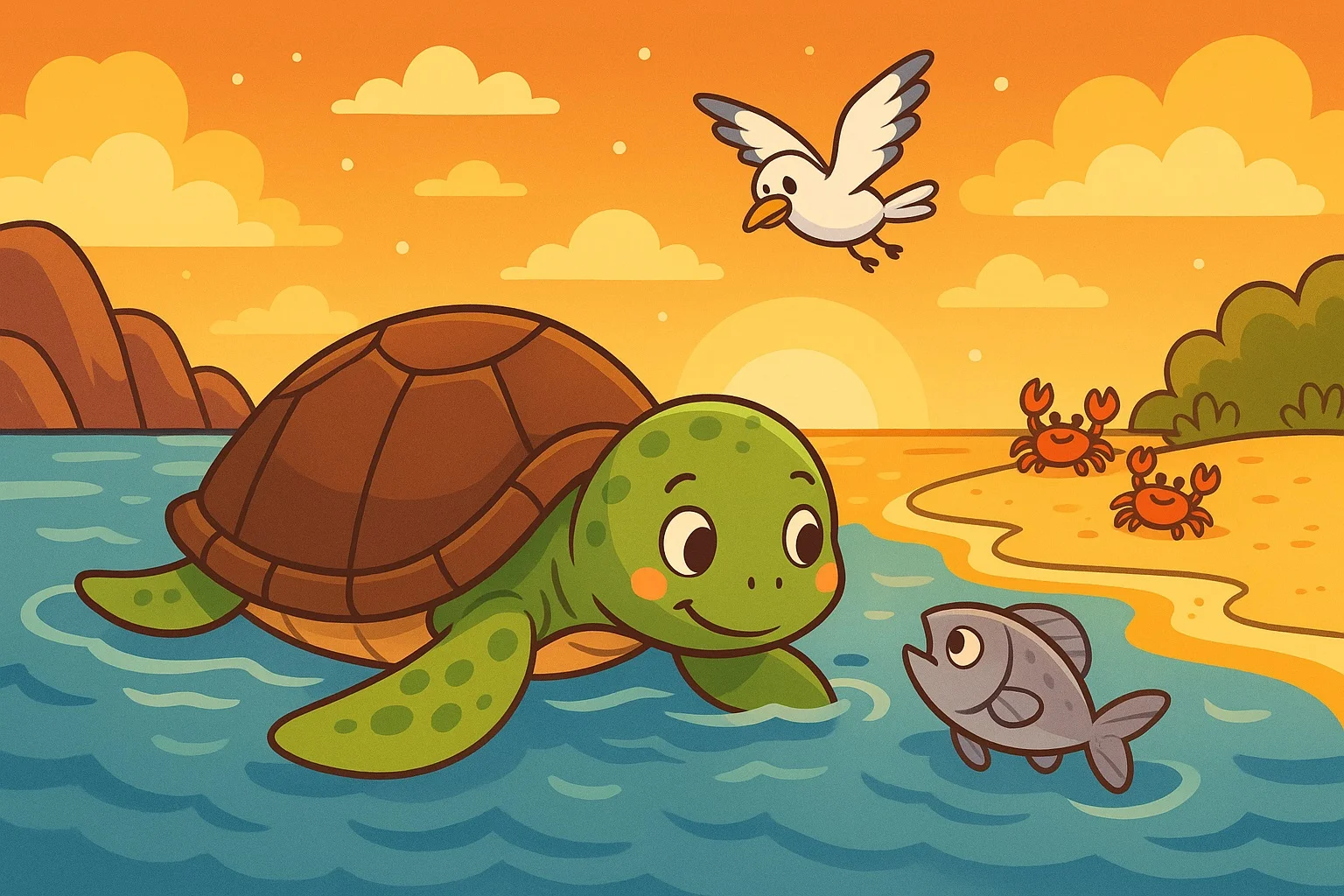 Once upon a calm evening by the wide blue sea, when the waves moved like deep breaths and the sky slowly dimmed into soft shades of violet, a young turtle named Milo rested near the shoreline. Milo was not the biggest turtle, nor the fastest, but his eyes carried a quiet curiosity that made the world feel larger and kinder.